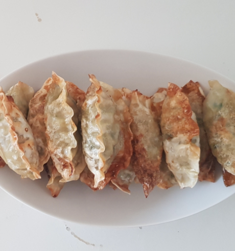 짠! 완성! 밑은 바삭하고 위는 촉촉한 찐만두 같은 일본 교자식 구운만두 완성.